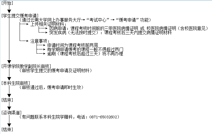 学生因病或其他特殊情况无法正常参加期末考试,可申请办理缓考。课程缓考申请时间为课程考核前两周,学生每学期申请缓考的课程一般不得超过两门。办理流程如下: