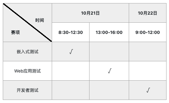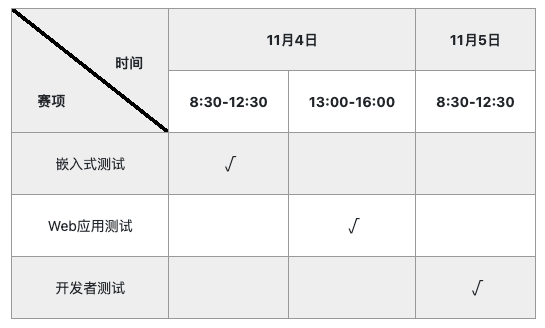 本届大赛面向全国全日制高等院校在校研究生、本科、专科学生以及高职、高专学生。本届大赛设置“拓思杯开发者测试大赛”、“中慧杯Web应用测试大赛”和“凯云杯嵌入式测试大赛”三个赛项。每个赛项分个人赛和高职团队赛两个赛道: