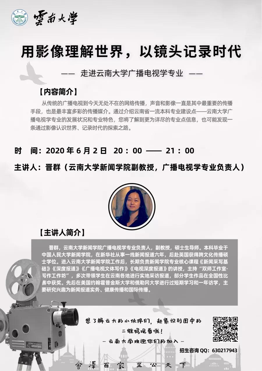 “用影像理解世界,以镜头记录时代”——走进云南大学广播电视学专业。从传统的广播电视到今天无处不在的网络传播,声音和影像一直是其中最重要的传播手段,也是最丰富多彩的传播媒介。通过介绍云南省一流本科专业建设点——云南大学广播电视学专业的发展状况和专业特色,您将了解到更为详尽的专业点信息,也可能发现一条通过影像认识世界、记录时代的探索之路。