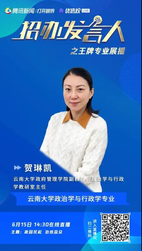 6月15日14:30,政府管理学院政治学与行政学教研室主任贺琳凯在线直播,为你详细讲解云南大学王牌专业。