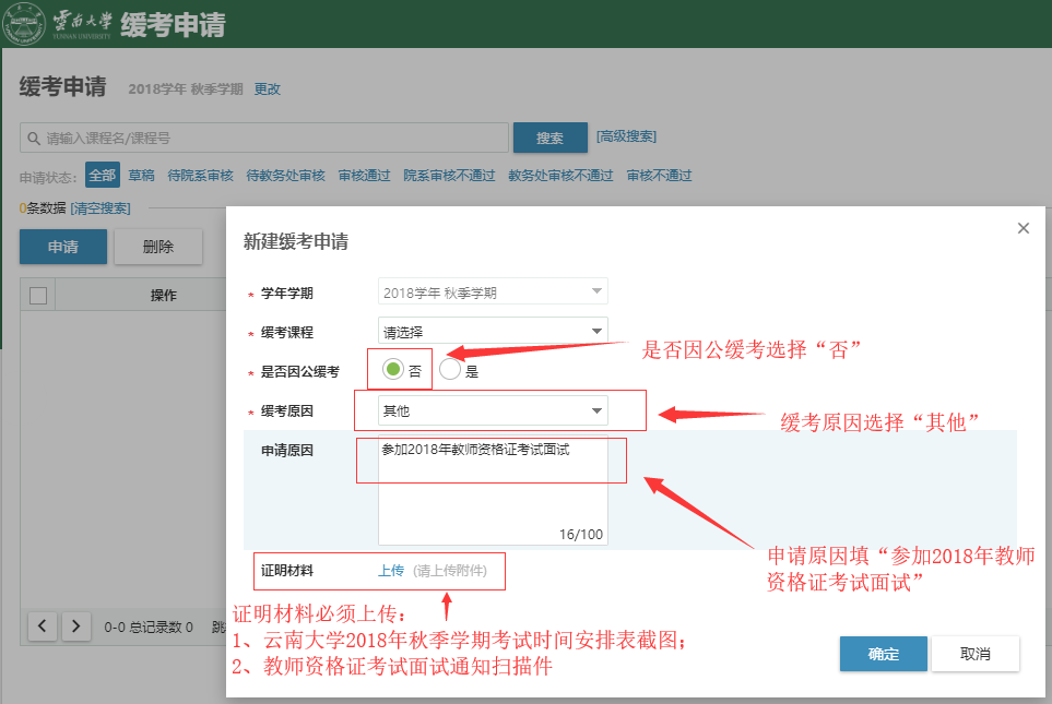 因参加教师资格证考试面试办理缓考的同学需在缓考申请中的“证明材料”中上传参加面试当日的《云南大学2018年秋季学期期末考试时间安排》、教师资格证考试个人面试时间通知(即发给考生本人的正式面试通知)的扫描件(注:面试公告、短信截图、QQ截图、邮件截图及其他非纸质通知无效)。