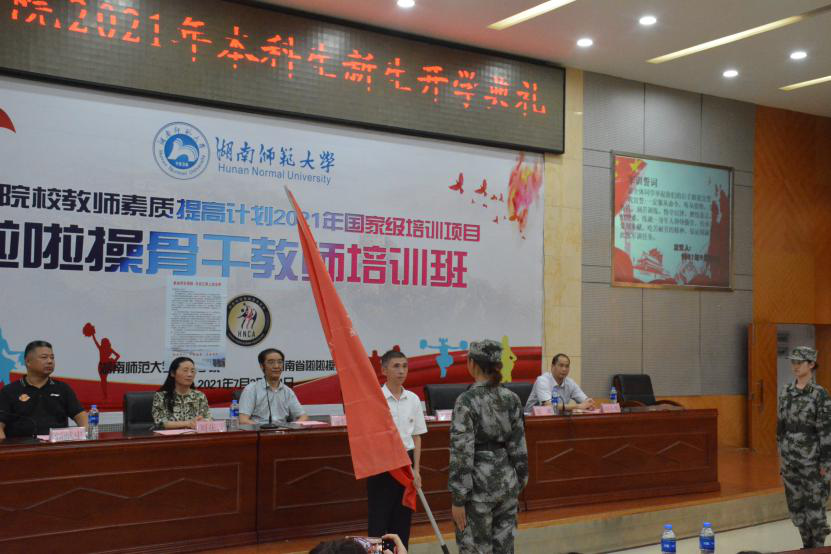 李明辉为体育学院2021级军训方阵授旗并合影留念。