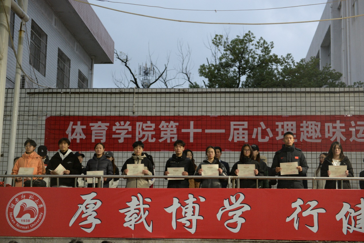本次升旗仪式公布湖南师范大学体育学院心理趣味运动会获奖名单。分别由我院学工办副主任李丽、2022级辅导员陈玲和李羽鑫、2023级辅导员梁一然和伍艾、2024级辅导员孔祥蕊和张宇桁为获得三等奖的队伍颁奖,学工办主任夏禹、团委书记王静为获得二等奖的队伍颁奖,党委副书记李皓为获得一等奖的队伍颁奖。颁奖仪式结束后合影留念。