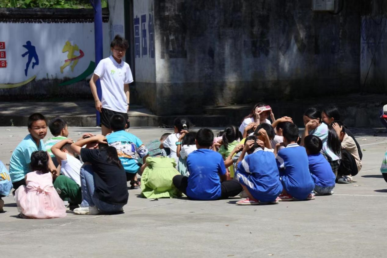 在模拟地震环节,学生们认真学习了“趴下、掩护、握固”的自救动作,并在震动停止后迅速有序地疏散到安全地带。同时,实践团成员还强调了地震后的心理调适和相互帮助的重要性,帮助学生们更好地应对地震带来的心理影响。
