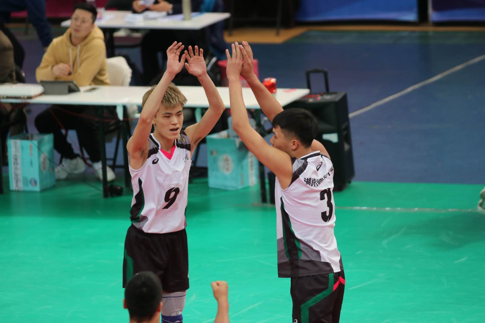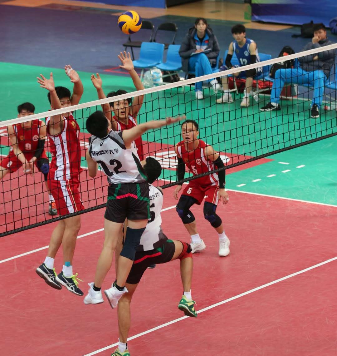第二局,湖南师范大学重整旗鼓,取得7:4的梦幻开局。然而局中阶段我校男排突然失去场上节奏,被中国石油大学反攻5分。随后的比赛没有太多波澜,湖南师范大学以25:23再输一城。