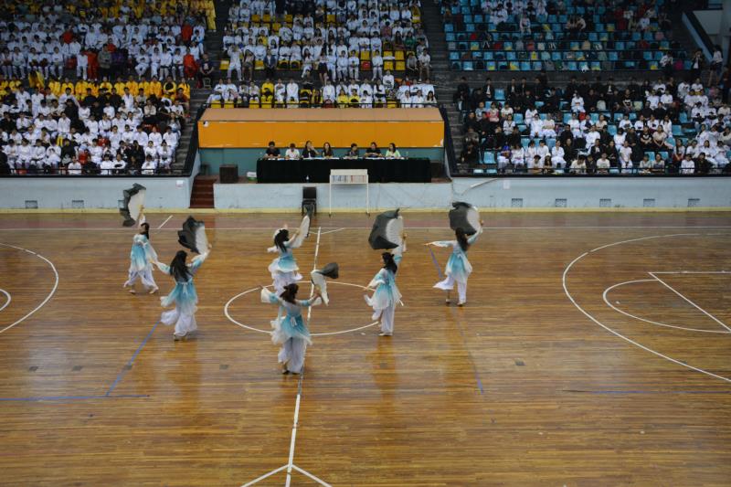 各学院太极拳代表队相继入场,在悠扬的乐曲声中,他们用行动阐述太极意蕴,一招一式尽显仙风道骨,且吟且舞尽显风采,为观众带来了一场视听盛宴。有的学院糅合了京剧的古风舞蹈,摆出了太极八卦阵,配上整齐划一的招式,赢得连连喝彩;有的学院以黑白相间的队列,融会贯通的招式,阐述了“太极生两仪,两仪生四象,四象生八卦,八卦衍万物”的太极真谛;大家行云流水般的动作配上轻缓婉转的曲调,充分展现太极的柔和与韧劲,将太极风骨体现得淋漓尽致。