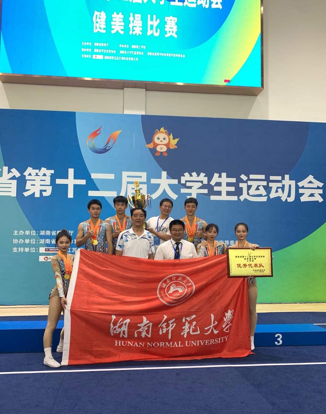 我校健美操队在院领导、全体教师及教研室全方位的支持下,不负众望斩获5金,为我校在湖南省第十二届大学生运动会各项目中勇担先锋,打了精彩漂亮的一仗。健美操队优异成绩的取得凝结着教练员和同学们的辛勤汗水和付出,汇聚着全校师生的支持与鼓励。特别是在比赛期间,汤琪同学不慎受伤。强忍伤痛的她坚持比赛,仍旧拿下三块金牌!