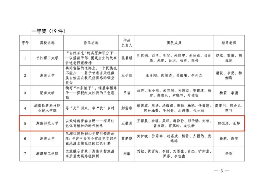 近日,由共青团湖南省委、湖南省教育厅、湖南省社会科学院、湖南省科学技术协会、湖南省学生联合会共同主办的第十五届“挑战杯”湖南省大学生课外学术科技作品竞赛红色专项活动获奖作品名单发布,我院由2021级武术与民族传统体育专业王馨晨等学生团队创作,郭恒涛、王静两位老师指导的参赛项目《以武铸魂青春当燃——探寻红色体育精神的时代传承》在大赛中荣获湖南省一等奖,取得学院该项赛事省赛零的突破,目前正在冲击国赛阶段。