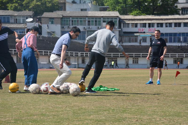 18日下午,中英双方教学人员在二里半校区田径场进行实践教学示范。授课以游戏的方式贯穿整个课堂,通过改变游戏内容和游戏规则对学生热身、技巧、战术进行练习并达到预期目标,以这种方式提高课堂的趣味性,高效性。