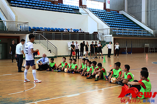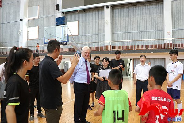 随后宾主双方来到行健馆篮球主馆,观摩了中外体教学生带领岳麓实验小学同学们举行的一场生动活泼的体育课。