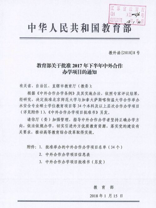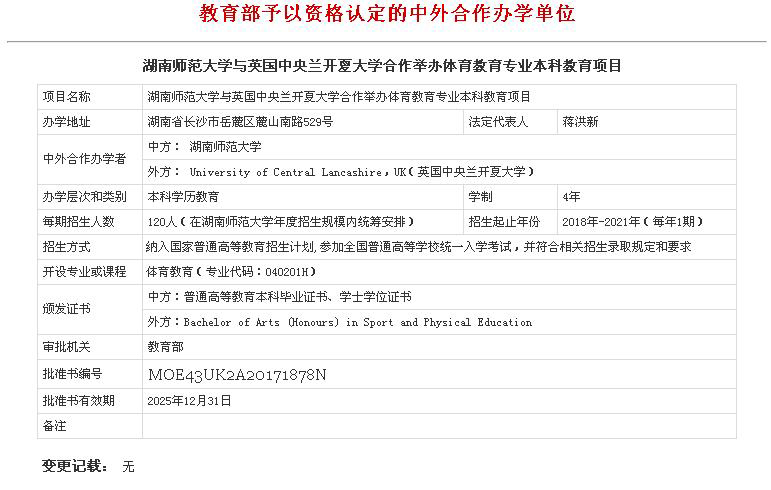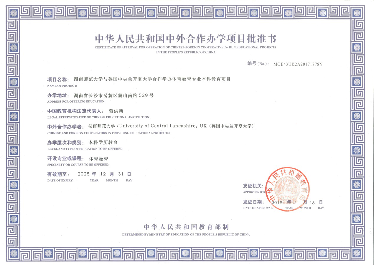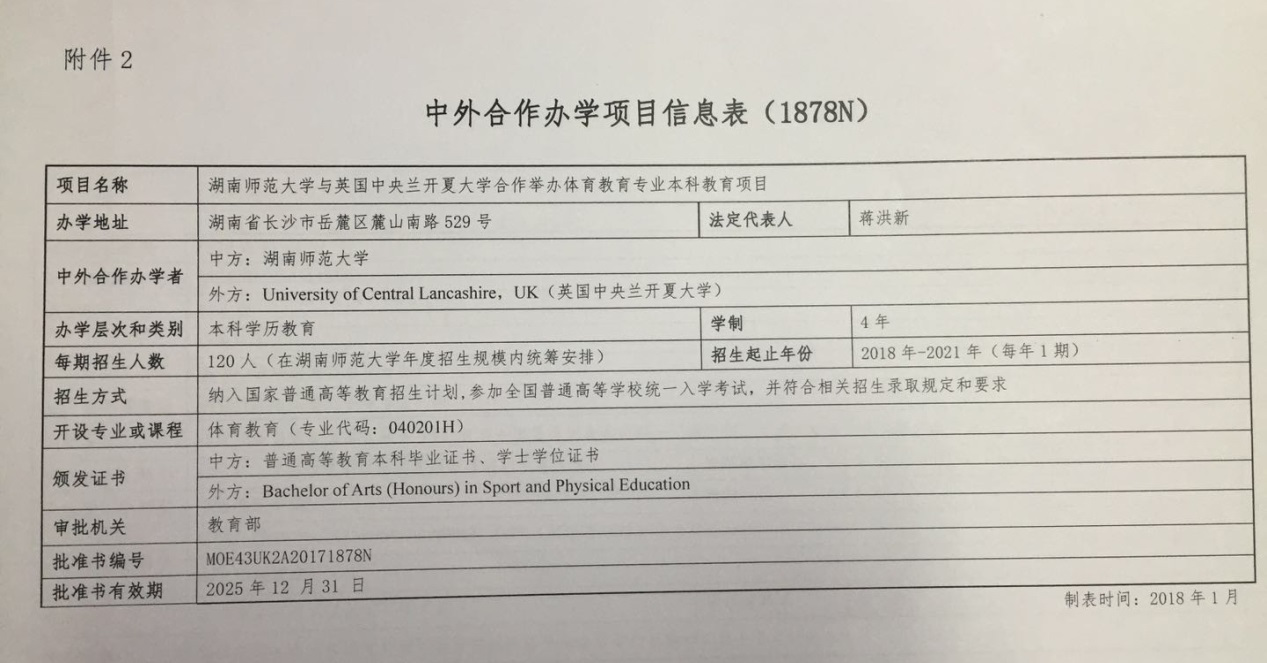 (供稿 教务办)根据教育部办公厅1月15日印发的《教育部关于批准2017年下半年中外合作办学项目的通知》(教外函〔2018〕8号),湖南师范大学与英国中央兰开夏大学合作举办体育教育专业(以足球教育为主)本科教育项目获教育部批准,项目批准书编号为:MOE43UK2A20171878N。该项目为全日制普通高等教育本科学历教育,学制四年,采用“4+0”合作办学模式,计划每年招收120(足球专项不少于50%)人,本项目招生列入国家普通高等学校教育招生计划,在本校年度招生规模内统筹安排。学生毕业时,经考核合格,可同时获得湖南师范大学本科毕业证书、学士学位和英国中央兰开夏大学(运动与体育)学士学位〔Bachelor of Arts (Honours) in Sport and Physical Education〕。