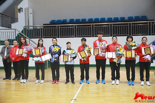 转场至体育馆中厅后,学生代表为冠军们献花。刘子兰为各位冠军依次颁发校外辅导员聘书。受聘为我校校外辅导员的冠军运动员分别是:第14届全运会攀岩男子速度冠军、我校体育学院2021级本科生龙金宝,第14届全运会女子水球冠军熊敦瀚,2012年伦敦奥运会羽毛球女双冠军田卿,2021年全国冠军赛团体冠军张弛,2008年北京奥运会、2016年里约奥运会男子举重冠军龙清泉,2018年雅加达亚运会女子自由式摔跤冠军周倩,2020年全国跆拳道锦标系列赛冠军向若鸣,2020年全国跆拳道锦标系列赛冠军彭姗,第14届全运会田径女子4*100米接力、田径女子4*400米接力冠军黄瑰芬。体育健儿们不断战胜自我,勇攀高峰,我校特聘冠军为校外辅导员,以期进一步带动深化体教结合,鼓励广大学子积极参加各类体育活动,科学释放全民健身运动发展新动能。