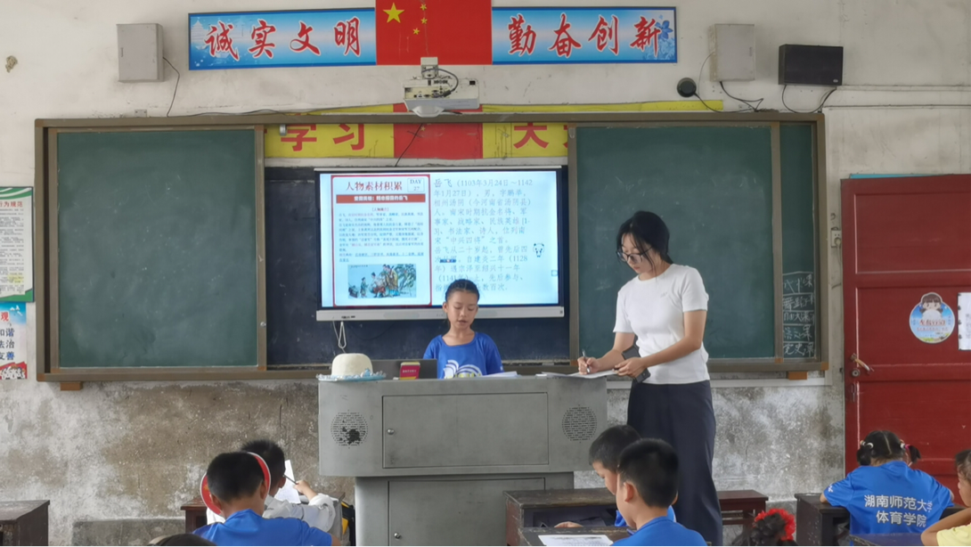 上午11时00分,湖南师范大学体育学院“领梦者”暑期社会实践团队队员彭子涵正教授一至三年级同学学习《满江红•写怀》,其通过深刻学习文章内容,介绍岳飞生平经历,感悟岳飞精忠报国的英雄之志,抒发爱国之情,培养学生们的报国之心。