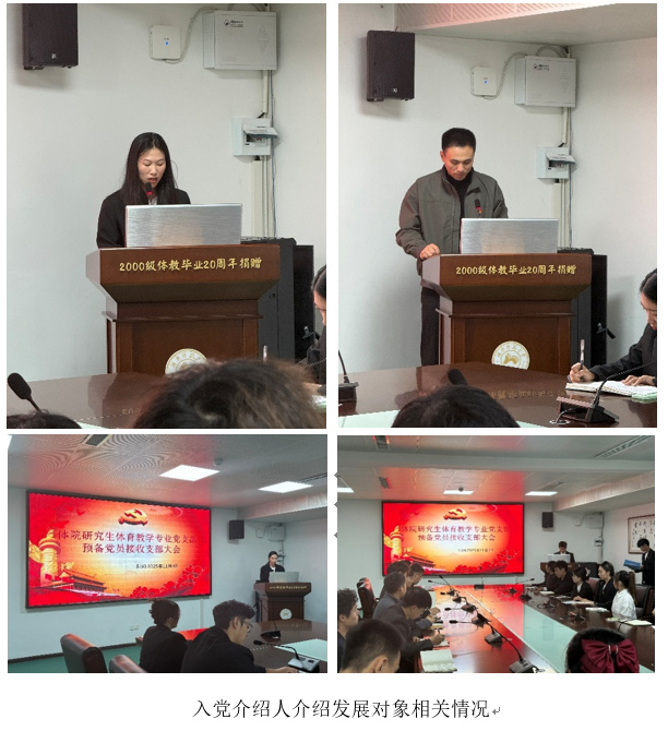 (通讯员:郑嘉璇、张鹤潆、李彬颉)为进一步加强党组织建设,壮大党员队伍,提升党员理论素养和党性修养,2025年11月4日,体育学院研究生体育教学专业党支部于游泳馆二楼会议室顺利召开预备党员接收支部大会,并同期举办了党员基本培训第二课交流研讨会。支部全体党员、发展对象参加会议。大会由支部学生委员郑嘉璇主持,支部党员参加会议。党员培训第二课督导组陈胜国教授、体育学院党委办李永峰老师、支部第一书记鲁春霞老师出席会议。