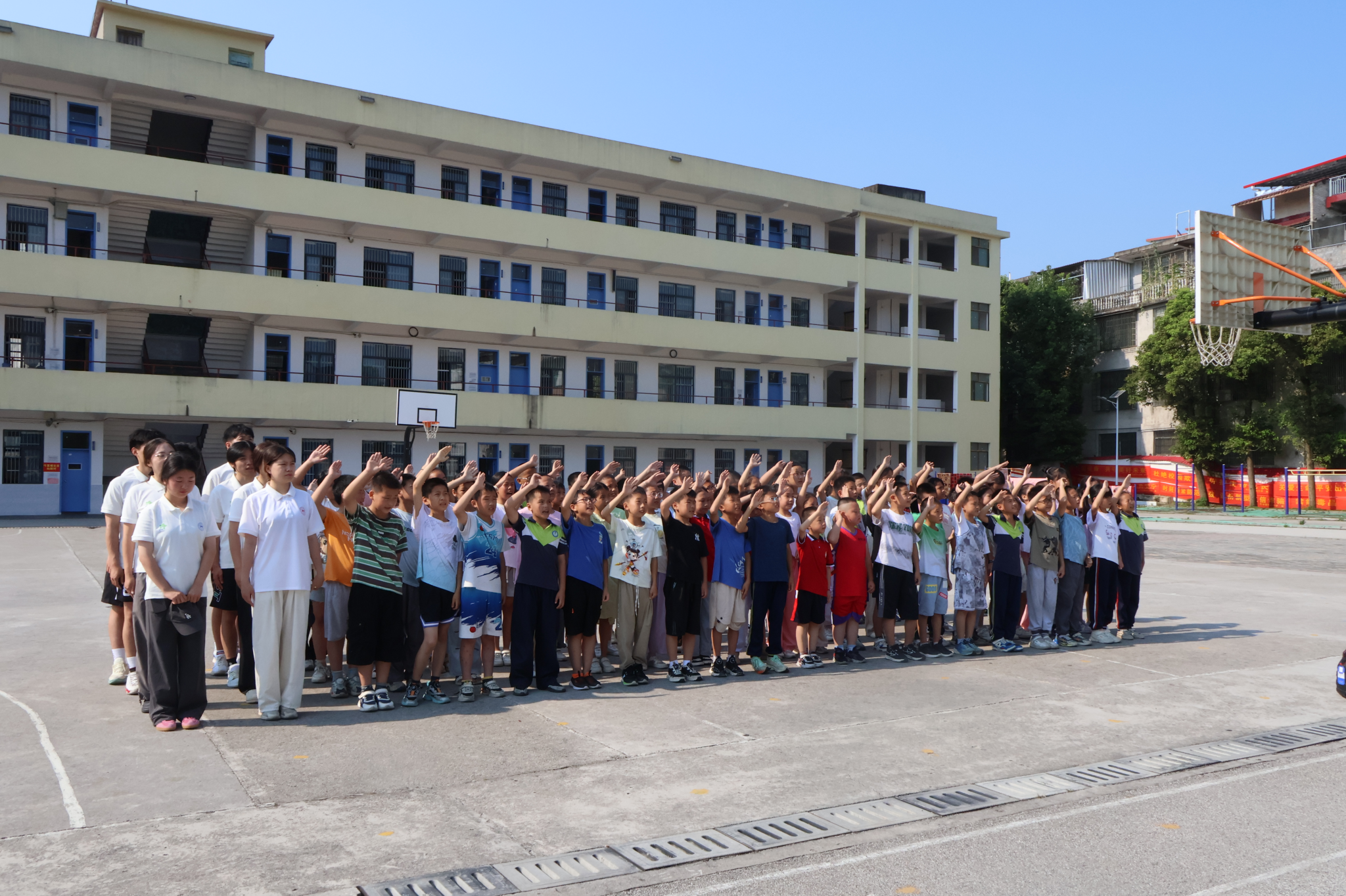 三支队伍在不同学校同时举行升旗仪式,全体成员庄严肃立,高唱国歌。三旗同升,象征着“领梦者”团队强大的凝聚力和使命感。通过这一仪式,团队成员们的心紧紧相连,进一步坚定了服务乡村教育的决心,展现了新时代青年的团队精神。湖南师范大学体育学院“领梦者”团队的“三下乡”活动,是高校青年学子践行团队精神的生动实践。他们运用专业知识和青春热情,为乡村教育事业贡献力量,体现了新时代青年的使命担当。